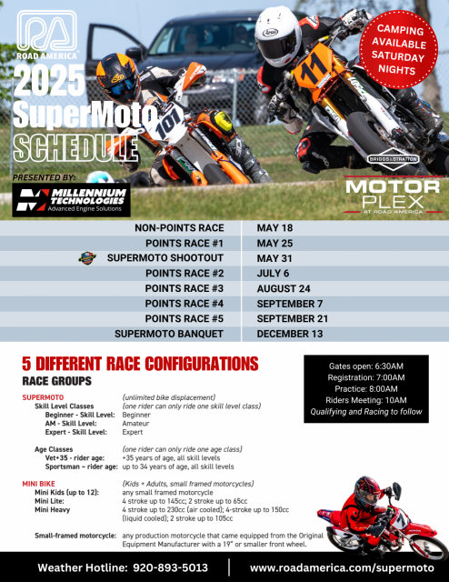 The Road America SuperMoto Series is a select group of racers participating in the fastest growing form of competition on two wheels! The SuperMoto Series is comprised of two race groups: SuperMoto and Mini Bike.