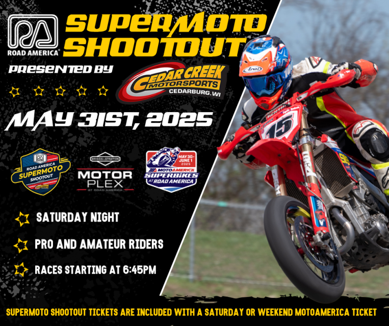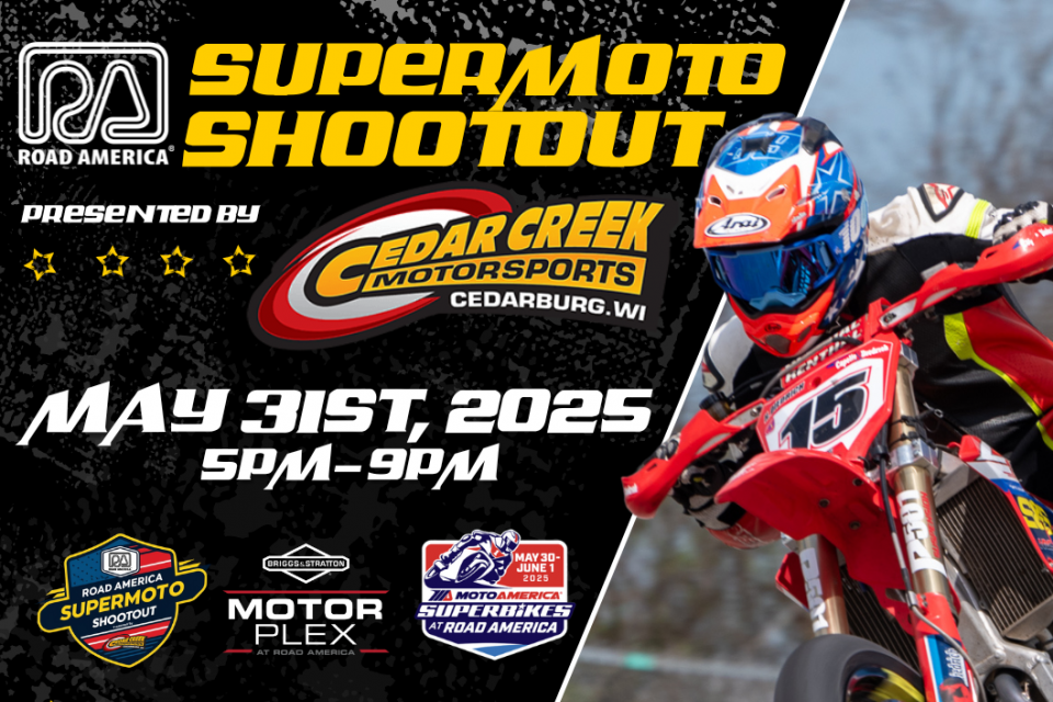 The Road America SuperMoto Series is a select group of racers participating in the fastest growing form of competition on two wheels! The SuperMoto Series is comprised of two race groups: SuperMoto and Mini Bike.